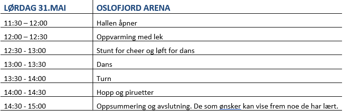 På slutten vil utøverne få muligheten til å vise frem noe de har øvd på og foreldre og foresatte er velkomne til å se på. Dette blir lavterskel, og en “sitte på matta” oppvisning for publikum.